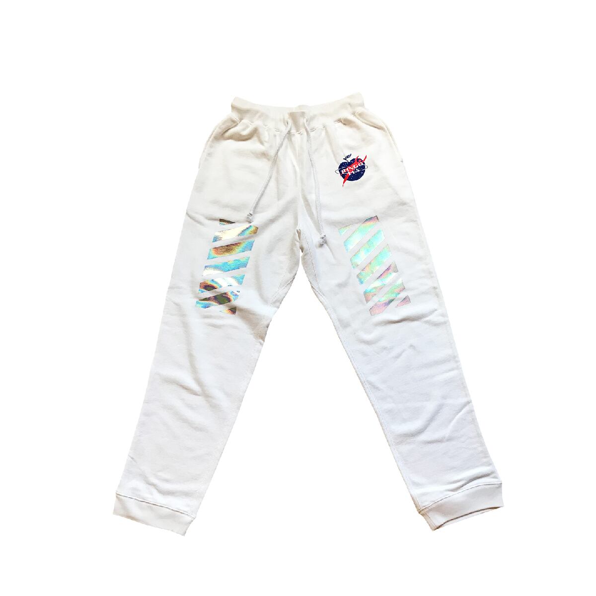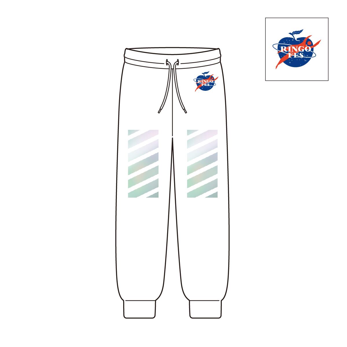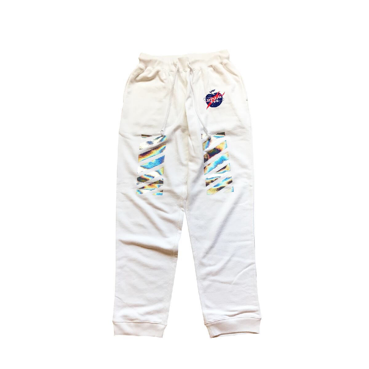 オーロラ箔をプリントしたスウェットパンツ。左腰下にNA〇Aっぽいデザインのプリントも。
